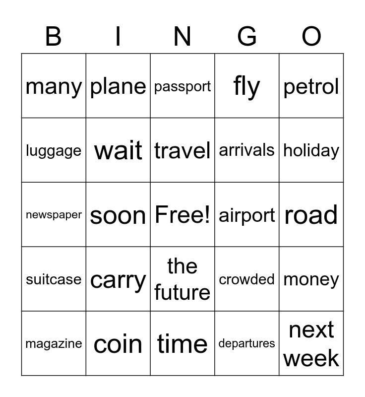 This bingo card has a free space and 28 words: money, passenger, arrivals, departures, luggage, passport, plane, suitcase, airport, magazine, newspaper, fly, coin, time, holiday, flight attendant, carry, wait, travel, the future, many, tomorrow, next week, soon, road, crowded, petrol and sky.