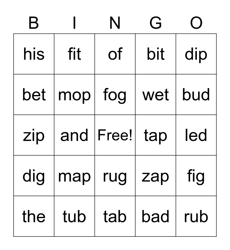 This bingo card has a free space and 29 words: the, a, and, is, his, of, mop, map, tap, tub, led, rub, tab, bad, bud, bug, rug, dig, dip, zip, zap, tax, wet, bet, bit, fit, fig, fog and rib.