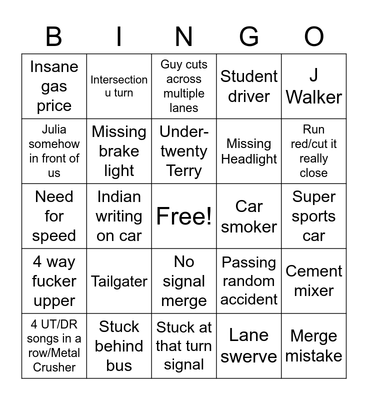 This bingo card has a free space and 24 words: Tailgater, Stuck behind bus, Under-twenty Terry, 4 UT/DR songs in a row/Metal Crusher, J Walker, Insane gas price, Julia somehow in front of us, Intersection u turn, Car smoker, No signal merge, Missing Headlight, Need for speed, Passing random accident, Cement mixer, Missing brake light, Lane swerve, Super sports car, Guy cuts across multiple lanes, Run red/cut it really close, Indian writing on car, Merge mistake, 4 way fucker upper, Student driver and Stuck at that turn signal.