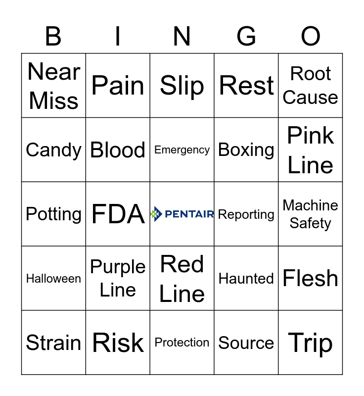 This bingo card has a free space and 45 words: Witness, Trip, Team Up, Strain, Spooky, Source, Slip, Sharp Object, Root Cause, Risk, Rest, Reporting, Red Line, Purple Line, Pumpkin, Protection, PPE, Potting, Pleater, Pink Line, Pain, OSHA, Oil Mist, Near Miss, Material Handling, Machine Safety, Incidents, Hazard, Haunted, Halloween, Green Line, Flesh, First Aid, Fire Safety, Filter, FDA, Fatal, Eye Wash, Ergonomics, Emergency, Candy, Boxing, Boo, Blood and Black line.