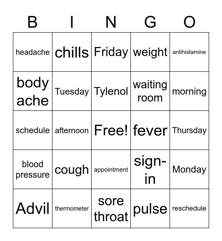 This bingo card has a free space and 25 words: cough, sore throat, Tylenol, Advil, antihistamine, headache, body ache, chills, fever, appointment, waiting room, schedule, sign-in, Monday, Tuesday, Wednesday, Thursday, Friday, morning, afternoon, reschedule, thermometer, blood pressure, weight and pulse.