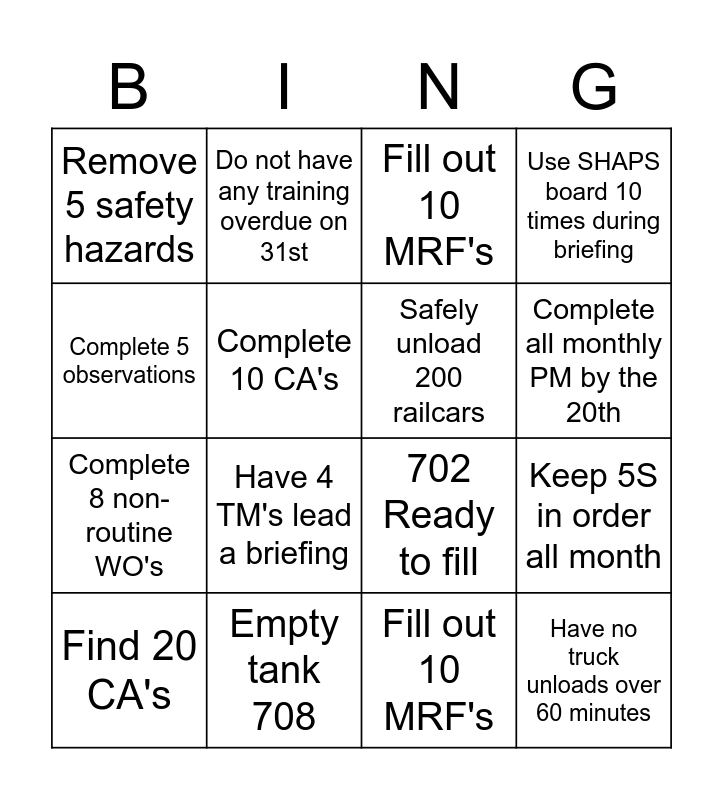 This bingo card has 17 words: Fill out 10 MRF's, Find 20 CA's, Fill out 10 MRF's, Remove 5 safety hazards, Have 4 TM's lead a briefing, Use SHAPS board 10 times during briefing, Keep 5S in order all month, Safely unload 200 railcars, Complete all monthly PM by the 20th, Complete 10 CA's, Empty tank 708, 702 Ready to fill, Complete 5 observations, Do not have any training overdue on 31st, Complete 8 non-routine WO's, Safely load 200 rail cars and Have no truck unloads over 60 minutes.