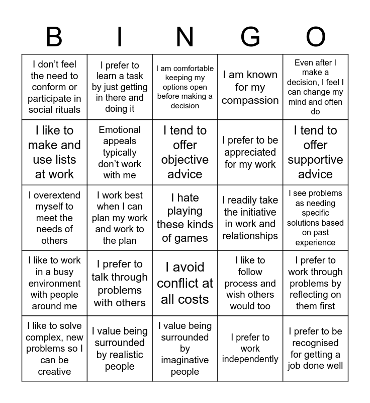 This bingo card has a free space and 24 words: I prefer to talk through problems with others, I value being surrounded by realistic people, I tend to offer objective advice, I like to solve complex, new problems so I can be creative, Even after I make a decision, I feel I can change my mind and often do, I don’t feel the need to conform or participate in social rituals, I like to make and use lists at work, I prefer to learn a task by just getting in there and doing it, I readily take the initiative in work and relationships, I avoid conflict at all costs, I prefer to be appreciated for my work, I overextend myself to meet the needs of others, I like to follow process and wish others would too, I prefer to work through problems by reflecting on them first, Emotional appeals typically don’t work with me, I prefer to work independently, I see problems as needing specific solutions based on past experience, I am comfortable keeping my options open before making a decision, I tend to offer supportive advice, I work best when I can plan my work and work to the plan, I prefer to be recognised for getting a job done well, I like to work in a busy environment with people around me, I am known for my compassion and I value being surrounded by imaginative people.
