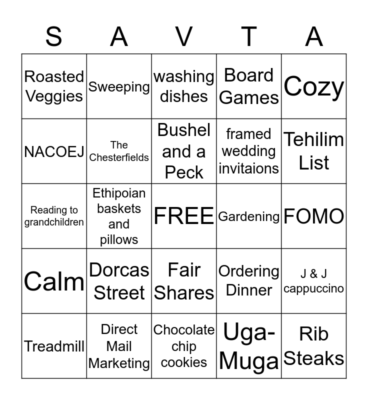 This bingo card has a free space and 24 words: Dorcas Street, Direct Mail Marketing, Bushel and a Peck, Treadmill, Cozy, Roasted Veggies, NACOEJ, Sweeping, Gardening, Fair Shares, framed wedding invitaions, Reading to grandchildren, Ordering Dinner, J & J cappuccino, The Chesterfields, Uga-Muga, FOMO, washing dishes, Tehilim List, Ethipoian baskets and pillows, Rib Steaks, Calm, Board Games and Chocolate chip cookies.