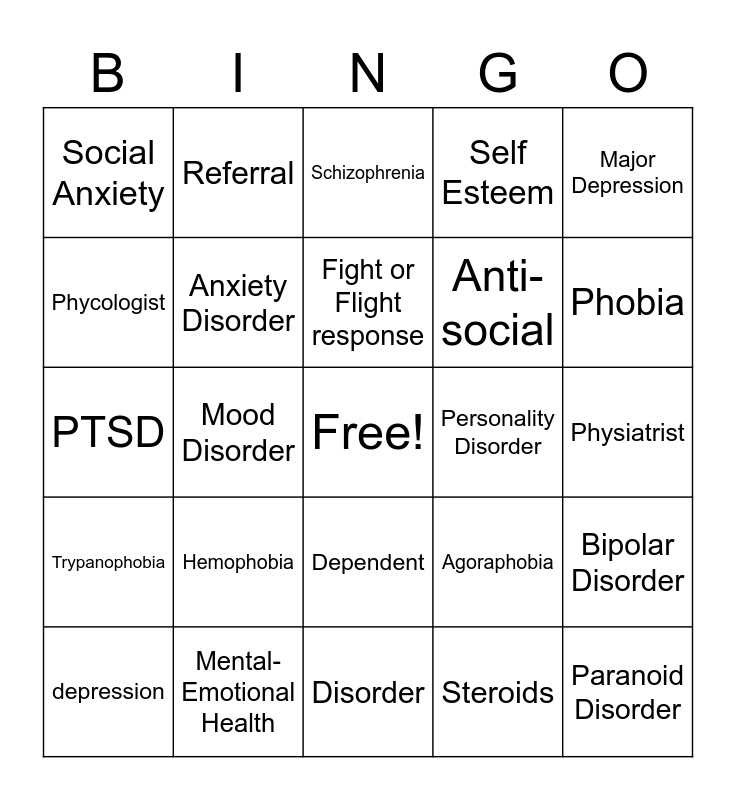 This bingo card has a free space and 29 words: depression, Clinical Social Worker, Mood Disorder, Acrophobia, Social Anxiety, Schizophrenia, Anxiety Disorder, Hemophobia, Personality Disorder, Mental-Emotional Health, Physiatrist, Paranoid Disorder, Disorder, Steroids, Phobia, Aviophobia, Dependent, Trypanophobia, Major Depression, PTSD, Agoraphobia, OCD, Anti-social, Phycologist, Self Esteem, Referral, Bipolar Disorder, Fight or Flight response and Achluophobia.
