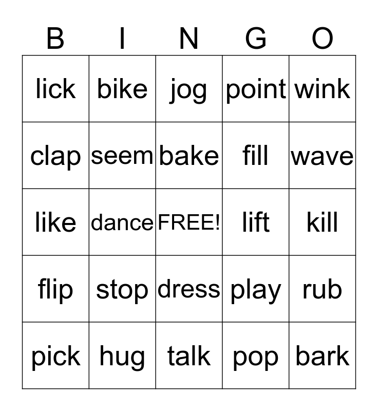 This bingo card has a free space and 24 words: stop, hug, bake, pick, wink, lick, clap, bike, lift, dress, fill, like, play, rub, seem, pop, kill, jog, wave, dance, bark, flip, point and talk.