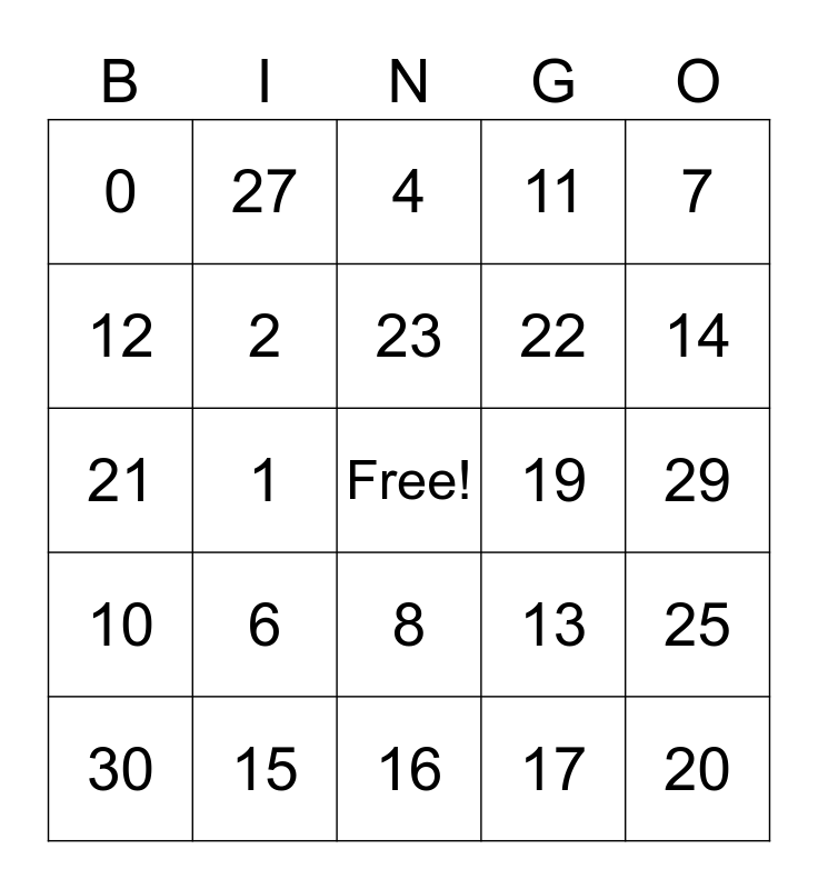 This bingo card has a free space and 24 words: 6, 15, 23, 30, 7, 0, 12, 27, 19, 8, 22, 21, 13, 25, 2, 17, 29, 4, 14, 1, 20, 10, 11 and 16.