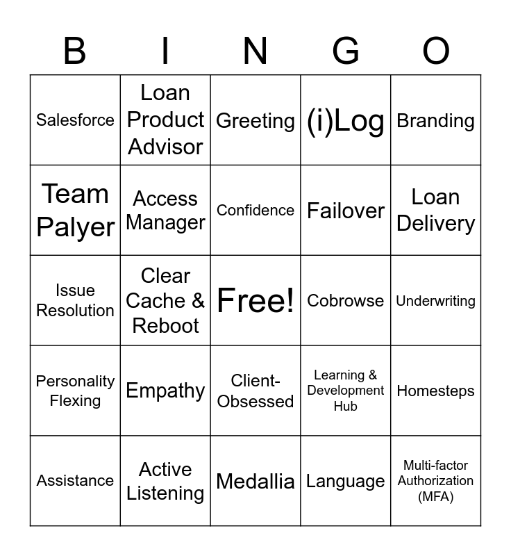 This bingo card has a free space and 24 words: Empathy, Active Listening, Confidence, Assistance, Branding, Salesforce, Team Palyer, Loan Product Advisor, Cobrowse, Client-Obsessed, Failover, Issue Resolution, Learning & Development Hub, Homesteps, Access Manager, Language, Underwriting, Greeting, Loan Delivery, Clear Cache & Reboot, Multi-factor Authorization (MFA), Personality Flexing, (i)Log and Medallia.