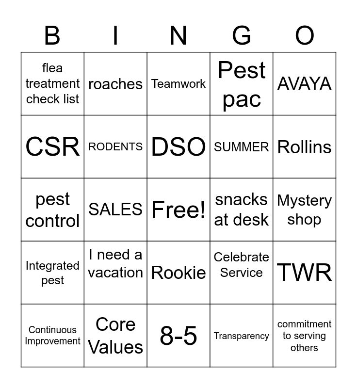 This bingo card has a free space and 44 words: collection calls, commitment to serving others, FUN, Continuous Improvement, People focused, Transparency, Teamwork, Cancel save, AVAYA, Core Values, Pest pac, snacks at desk, Rookie, I need a vacation, Mondays, 8-5, 9-6, pest control, Taexx, Rollins, roaches, rats, wasps, flea treatment check list, mapcode, Mystery shop, HomeTeam, A-Player, Celebrate Service, Integrated pest, Quarterly, TWR, TECHNICIAN, MASTER TECH, SALES, TRADITIONAL TREATMENT, CUSTOVER SAVED, BAD DEBT, DSO, CSR, SUMMER, WINTER, RODENTS and OUR VISION.