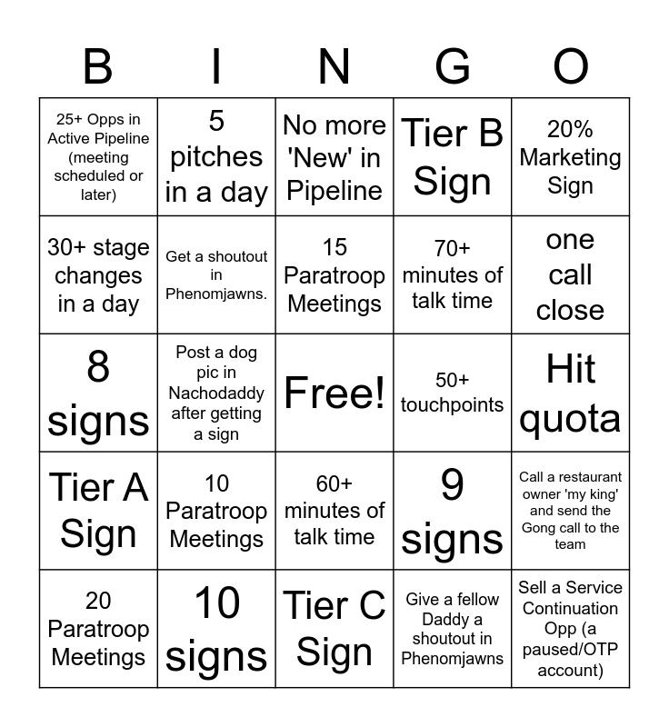This bingo card has a free space and 24 words: 10 Paratroop Meetings, 10 signs, 15 Paratroop Meetings, 20 Paratroop Meetings, 20% Marketing Sign, 25+ Opps in Active Pipeline (meeting scheduled or later), 30+ stage changes in a day, 5 pitches in a day, 50+ touchpoints, 60+ minutes of talk time, 70+ minutes of talk time, 8 signs, 9 signs, Call a restaurant owner 'my king' and send the Gong call to the team, Get a shoutout in Phenomjawns., Give a fellow Daddy a shoutout in Phenomjawns, Hit quota, No more 'New' in Pipeline, one call close, Post a dog pic in Nachodaddy after getting a sign, Sell a Service Continuation Opp (a paused/OTP account), Tier A Sign, Tier B Sign and Tier C Sign.
