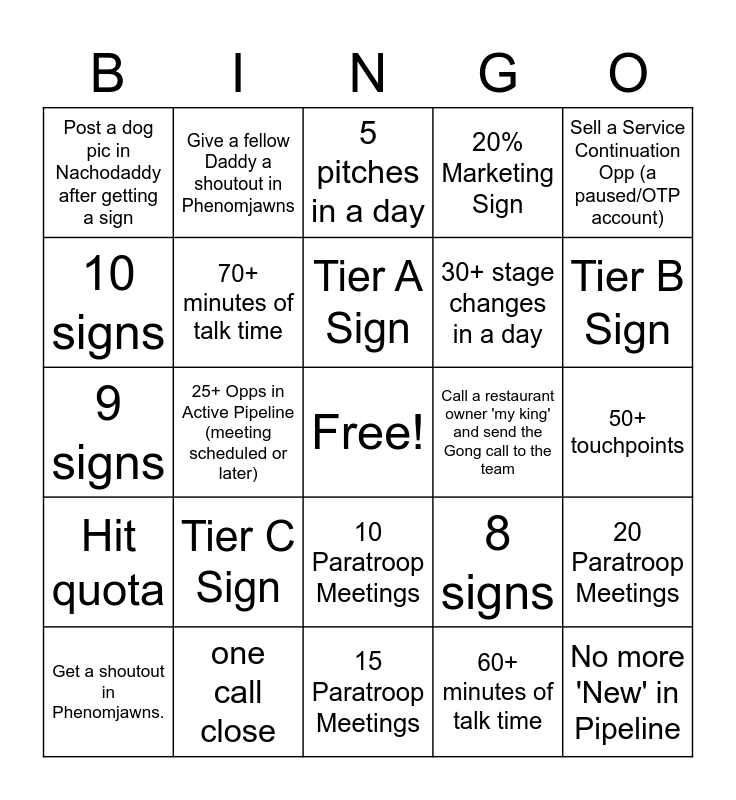 This bingo card has a free space and 24 words: Tier C Sign, one call close, Tier A Sign, Get a shoutout in Phenomjawns., Sell a Service Continuation Opp (a paused/OTP account), Post a dog pic in Nachodaddy after getting a sign, 10 signs, Give a fellow Daddy a shoutout in Phenomjawns, Call a restaurant owner 'my king' and send the Gong call to the team, 10 Paratroop Meetings, 30+ stage changes in a day, 9 signs, 8 signs, 20 Paratroop Meetings, 70+ minutes of talk time, 60+ minutes of talk time, 50+ touchpoints, 5 pitches in a day, Tier B Sign, 25+ Opps in Active Pipeline (meeting scheduled or later), No more 'New' in Pipeline, Hit quota, 20% Marketing Sign and 15 Paratroop Meetings.