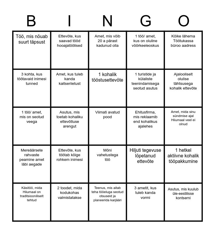 This bingo card has a free space and 24 words: Ettevõte, kus töötab kõige rohkem inimesi, 2 toodet, mida kodukohas valmistatakse, 1 kohalik tööstusettevõte, Käsitöö, mida Hiiumaal on traditsiooniliselt tehtud, Kõike lähema Töötukassa büroo aadress, Töö, mis nõuab suurt täpsust, 3 kohta, kus töötavaid inimesi tunned, Ettevõte, kus saavad tööd hooajatöölised, Ehitusfirma, mis reklaamib end kohalikus ajalehes, Mõni vahetustega töö, 1 turistide ja külaliste teenindamisega seotud asutus, 1 töö/ amet, mis on seotud veega, Hiljuti tegevuse lõpetanud ettevõte, 1 hetkel aktiivne kohalik tööpakkumine, Amet, kus tuleb kanda kaitseriietust, 3 ametit, kus tuleb kanda vormi, Amet, mida sinu sündmise ajal Hiiumaal veel ei olnud, Amet, mis võib 20 a pärast kadunud olla, Ajalooliselt olulise tähtsusega kohalik ettevõte, Asutus, mis toetab kohaliku ettevõtluse arengut, Asutus, mis kuulub üle-eestilisse kontserni, Mereäärsete rahvaste peamine amet läbi aegade, 1 töö/ amet, kus on oluline võõrkeeleoskus and Teenus, mis aitab teha tööeluga seotud otsuseid ja planeerida karjääri.