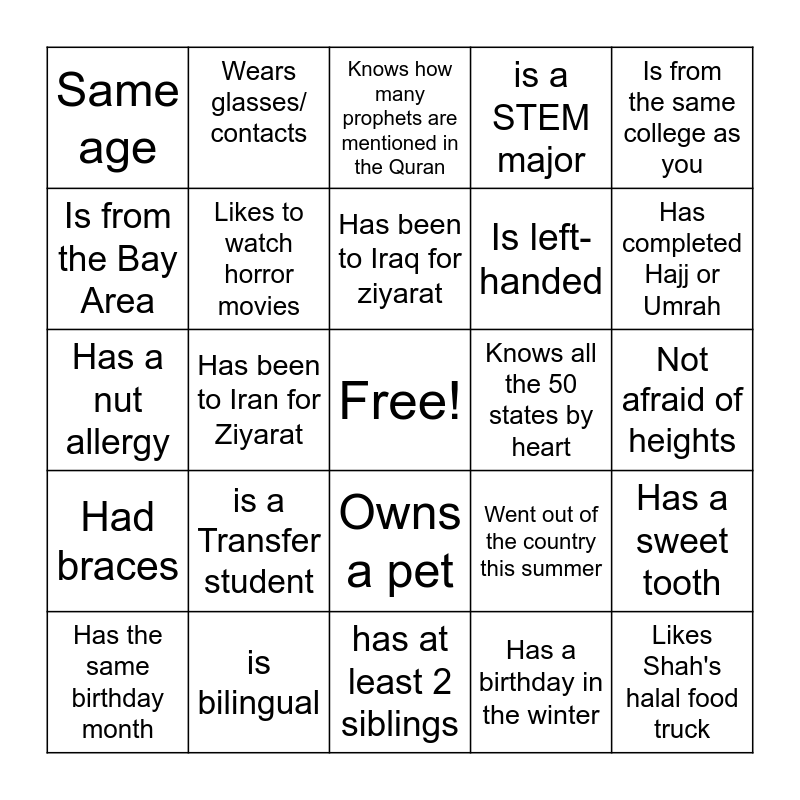 This bingo card has a free space and 24 words: is a Transfer student, is bilingual, Has been to Iraq for ziyarat, Has the same birthday month, Is from the same college as you, Same age, Is from the Bay Area, Wears glasses/ contacts, Knows all the 50 states by heart, Owns a pet, Is left-handed, Has a nut allergy, Went out of the country this summer, Has a sweet tooth, Likes to watch horror movies, Has a birthday in the winter, Not afraid of heights, Knows how many prophets are mentioned in the Quran, Has completed Hajj or Umrah, Has been to Iran for Ziyarat, Likes Shah's halal food truck, Had braces, is a STEM major and has at least 2 siblings.