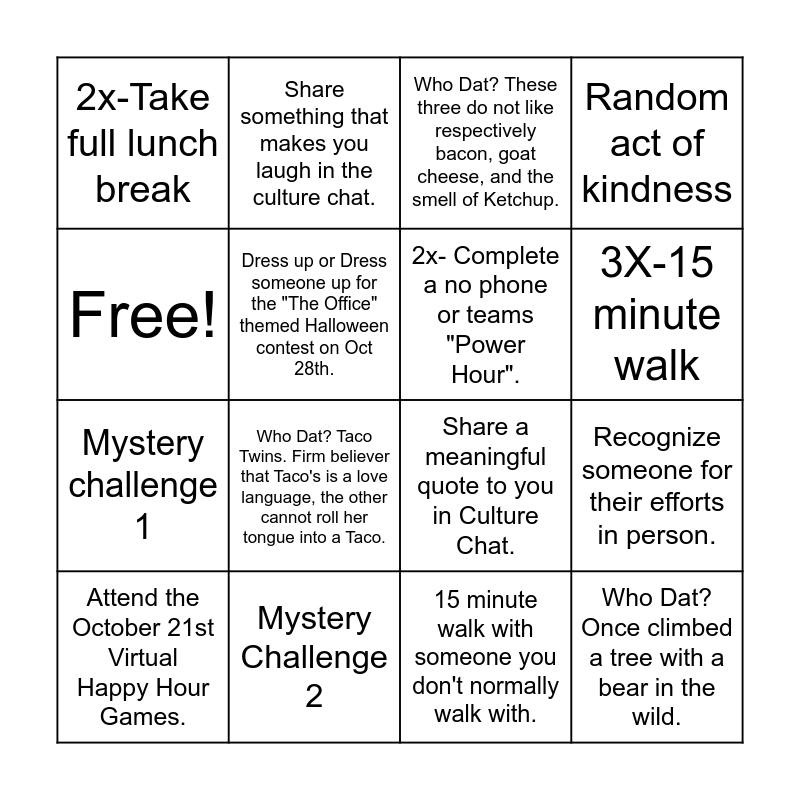 This bingo card has 16 words: Mystery Challenge 2, Recognize someone for their efforts in person., Who Dat? These three do not like respectively bacon, goat cheese, and the smell of Ketchup., 2x-Take full lunch break, Mystery challenge 1, Share something that makes you laugh in the culture chat., Share a meaningful quote to you in Culture Chat., 15 minute walk with someone you don't normally walk with., Free!, Dress up or Dress someone up for the "The Office" themed Halloween contest on Oct 28th., Attend the October 21st Virtual Happy Hour Games., Random act of kindness, Who Dat? Taco Twins. Firm believer that Taco's is a love language, the other cannot roll her tongue into a Taco., 3X-15 minute walk, 2x- Complete a no phone or teams "Power Hour". and Who Dat? Once climbed a tree with a bear in the wild..