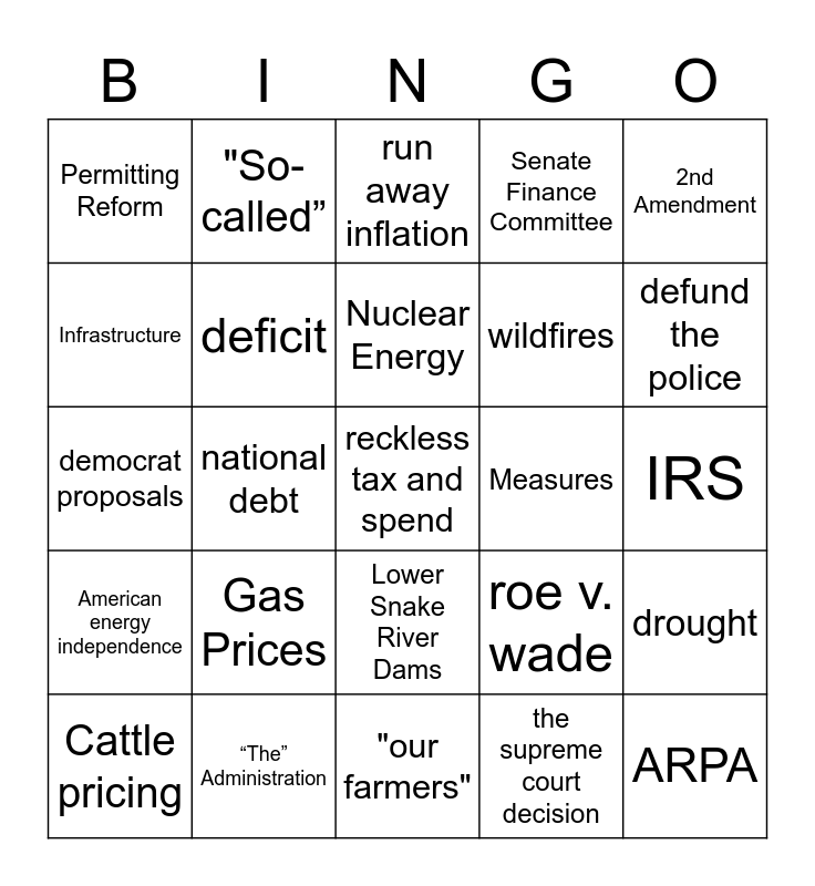 This bingo card has a free space and 24 words: Gas Prices, “The” Administration, Nuclear Energy, Cattle pricing, 2nd Amendment, Permitting Reform, Infrastructure, "So-called”, Measures, Lower Snake River Dams, wildfires, democrat proposals, roe v. wade, drought, deficit, the supreme court decision, IRS, run away inflation, defund the police, national debt, ARPA, American energy independence, Senate Finance Committee and "our farmers".