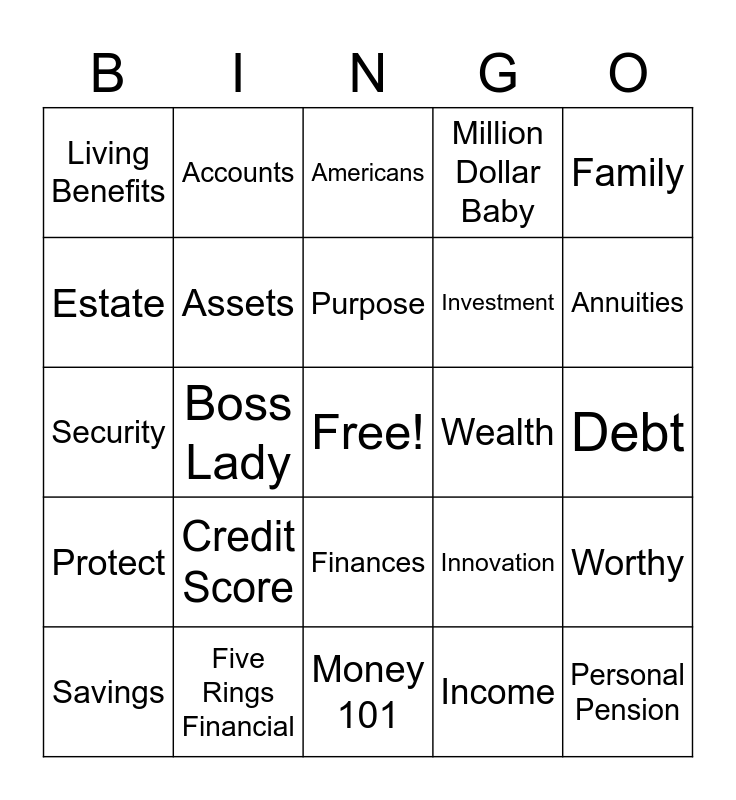 This bingo card has a free space and 34 words: Budget, Income, Tax Free, Women, Protect, Assets, Family, Savings, Accounts, Wine, Purpose, Americans, Instability, Average, Wealth, Annuities, Five Rings Financial, Security, Credit Score, Innovation, Finances, Bills, Living Benefits, Debt, Money 101, Personal Pension, Million Dollar Baby, Trust, Investment, Estate, Infinite Banking, Boss Lady, Worthy and Enough.