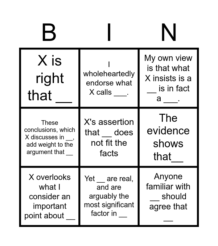 This bingo card has 9 words: X overlooks what I consider an important point about __, My own view is that what X insists is a __ is in fact a ___., I wholeheartedly endorse what X calls ___., These conclusions, which X discusses in __, add weight to the argument that __, X is right that __, The evidence shows that__, X's assertion that __ does not fit the facts, Anyone familiar with __ should agree that __ and Yet __ are real, and are arguably the most significant factor in __.