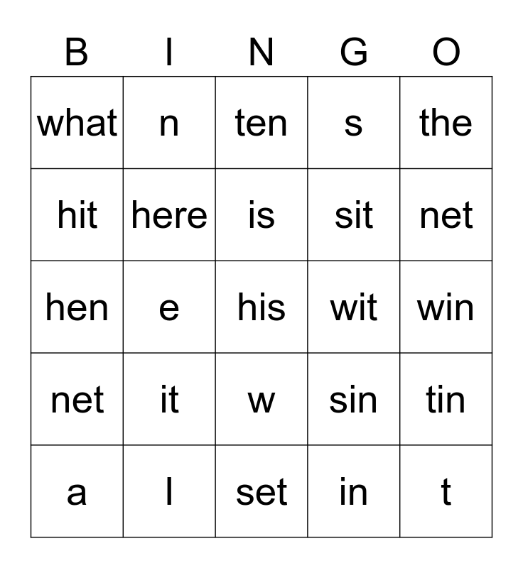 This bingo card has a free space and 24 words: it, I, is, a, the, what, hit, n, wit, w, sit, hen, sin, tin, here, in, win, ten, net, e, t, net, s and set.