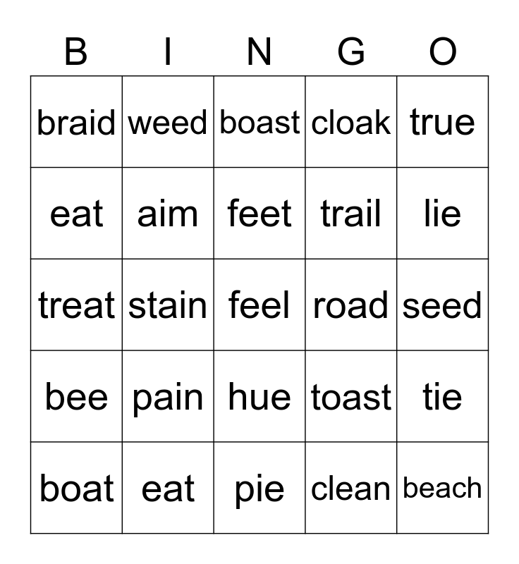 This bingo card has a free space and 24 words: pain, eat, feet, boat, true, braid, eat, weed, road, hue, trail, treat, toast, tie, aim, clean, seed, boast, lie, stain, beach, bee, cloak and pie.