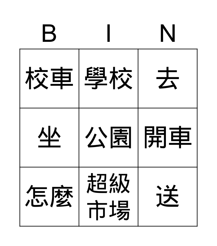 This bingo card has a free space and 9 words: 怎麼, 去, 學校, 坐, 校車, 開車, 送, 走路 and 超級市場.