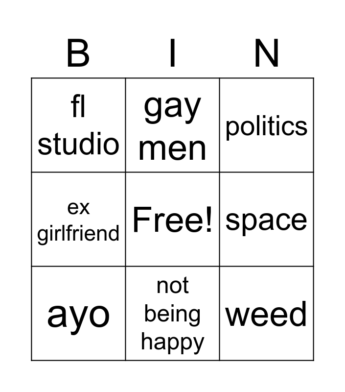 This bingo card has a free space and 8 words: space, politics, gay men, ayo, fl studio, weed, ex girlfriend and not being happy.