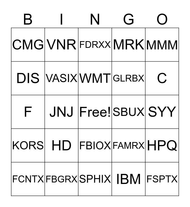 This bingo card has a free space and 24 words: HD, FBGRX, WMT, FCNTX, MMM, CMG, DIS, VNR, SBUX, FBIOX, GLRBX, F, FAMRX, HPQ, VASIX, IBM, SYY, FDRXX, C, JNJ, FSPTX, KORS, MRK and SPHIX.
