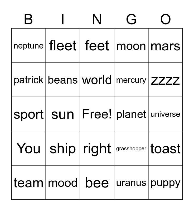 This bingo card has a free space and 52 words: pretty, puppy, cat, bee, ship, space, fleet, night, patrick, stars, beans, toes, toast, grasshopper, disney, princess, world, planet, earth, mars, sun, uranus, neptune, mercury, sleep, dream, blanket, nap, zzzz, pillow, sheets, moon, dark, people, black, feet, mood, hand, bar, guts, water, universe, You, have, right, idea, games, sport, field, coach, team and players.