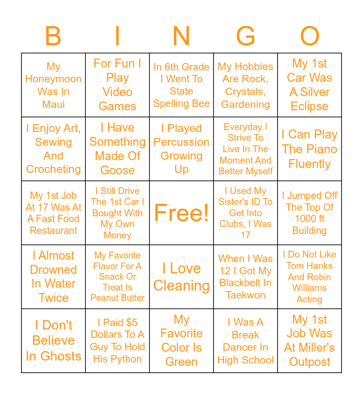 This bingo card has a free space and 34 words: I Lived In Flordia, California And Washington, I Was A Break Dancer In High School, I Came In 2nd Place On Game Show Weakest Link, I Can Skateboard, I Almost Drowned In Water Twice, I Have Something Made Of Goose, My 1st Car Was A Silver Eclipse, I Don't Believe In Ghosts, For Fun I Play Video Games, My Favorite Movie Is Dirty Dancing, I Played Percussion Growing Up, In 6th Grade I Went To State Spelling Bee, In 5th Grade I Won The Spelling Bee, I Took Acting Classes In College, I Used My Sister's ID To Get Into Clubs, I Was 17, I Can Play The Piano Fluently, I Paid $5 Dollars To A Guy To Hold His Python, My 1st Job At 17 Was At A Fast Food Restaurant, My Favorite Flavor For A Snack Or Treat Is Peanut Butter, When I Was 12 I Got My Blackbelt In Taekwon, I Love Cleaning, I Got Yelled At For Entering The Wrong Gender Restroon By Mistake In A Airport, My Honeymoon Was In Maui, I Jumped Off The Top Of 1000 ft Building, My Favorite Color Is Green, My 1st Job Was At Miller's Outpost, My Hobbies Are Rock, Crystals, Gardening, I Hate Cold Fruit And Cold Water, Everyday I Strive To Live In The Moment And Better Myself, I Enjoy Art, Sewing And Crocheting, I Was On A TV Show, I Still Drive The 1st Car I Bought With My Own Money, I Do Not Like Tom Hanks And Robin Williams Acting and I Work Out Once A Day.