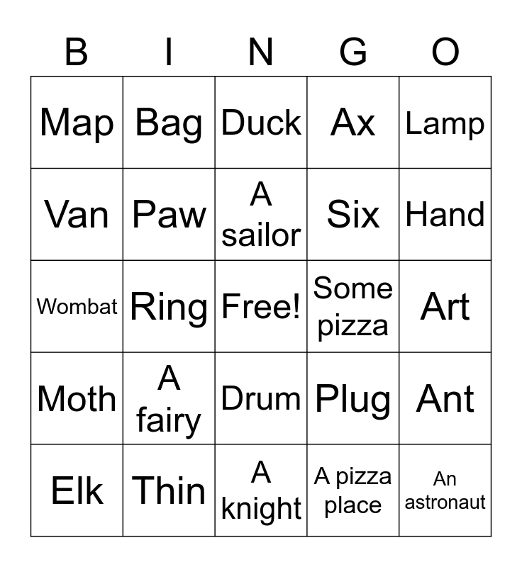 This bingo card has a free space and 29 words: Elk, Tuesday, Ring, Meat, Map, Duck, Paw, A fairy, Some pizza, Thin, Art, An astronaut, A knight, A pizza place, Hand, Wash the car, Drum, Moth, Lamp, Wombat, Plug, Chin, Six, Van, Ax, Bag, Ant, A sailor and A superhero.