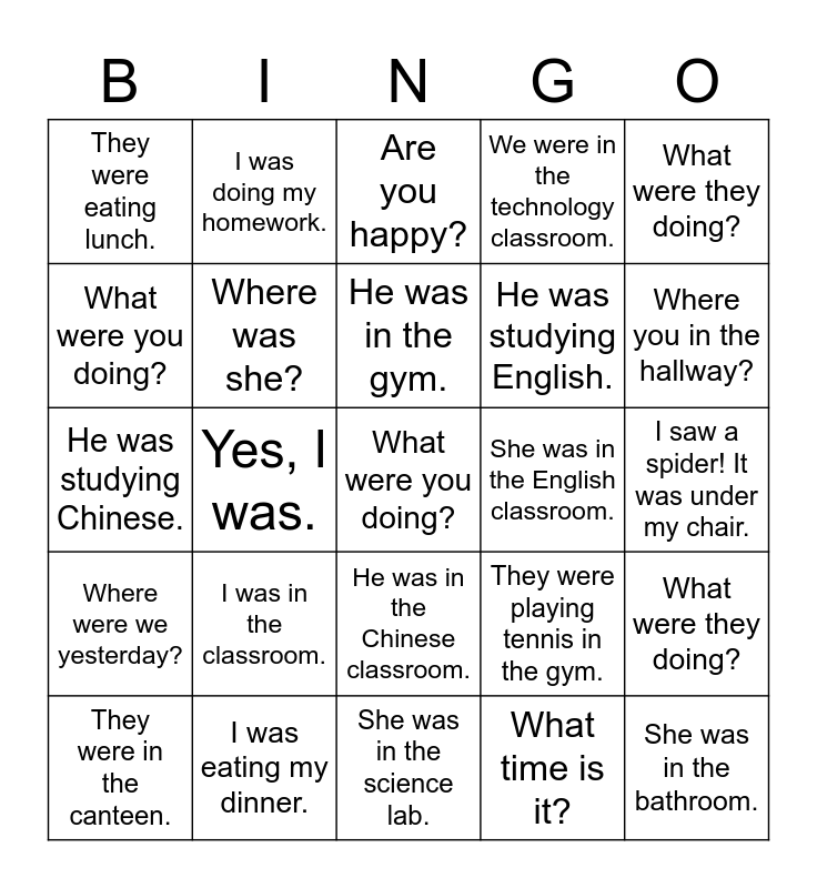 This bingo card has 25 words: I was in the classroom., She was in the science lab., He was in the gym., They were in the canteen., What were they doing?, They were eating lunch., What were you doing?, I was doing my homework., She was in the English classroom., He was in the Chinese classroom., He was studying English., He was studying Chinese., They were playing tennis in the gym., What were they doing?, Where was she?, She was in the bathroom., I saw a spider! It was under my chair., Are you happy?, Where you in the hallway?, Yes, I was., What were you doing?, I was eating my dinner., Where were we yesterday?, We were in the technology classroom. and What time is it?.