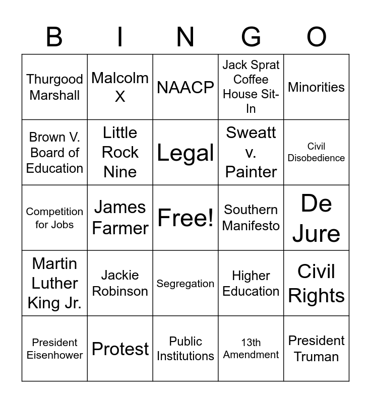 This bingo card has a free space and 88 words: Struggle, Equality, Segregation, Discrimination, Jim Crow Laws, Inequality, Plessy v. Ferguson, Separate But Equal Doctrine, Law, Custom, 14th Amendment, Supreme Court, Civil Rights, De Jure, De Facto, Legal, Systematic, Constitutional, Unconstitutional, Reality, Invisible, Great Migration, Competition for Jobs, Social Movement, 13th Amendment, 15th Amendment, March on Washington, Executive Order 8802, Double v Campaign, CORE, NAACP, Jack Sprat Coffee House Sit-In, Journey of Reconciliation, Prejudice, Jackie Robinson, Brown V. Board of Education, Thurgood Marshall, W.E.B. Dubois, Growth of African American Newspapers, Civil Disobedience, James Farmer, Desegregation, Public Schools, Higher Education, Southern Manifesto, Emmett Till, Executive Order 9980, Executive Order 9981, Presidential Committee on Civil Rights, Sweatt v. Painter, Justice, Freedom, Equal Protection, Boycott, Montgomery, Rosa Parks, Martin Luther King Jr., Malcolm X, Nonviolence, Public Transportation, Freedom Rides, Grassroots, Southern Christian Leadership Conference (SCLC), Religion, American Ideals, Protest, Gandhi, Little Rock Nine, President Eisenhower, President Truman, FDR, National Guard, Voting, Minorities, Civil Rights Act of 1957, Civil Rights Act of 1960, Forced Relocation, Pittsburgh Courier, Public Institutions, Integrate, "Soul Force", Equality of Opportunity, Federal Government, Black Panthers, Paul Robeson, A. Phillip Randolph, Angry Resistance and Fear.