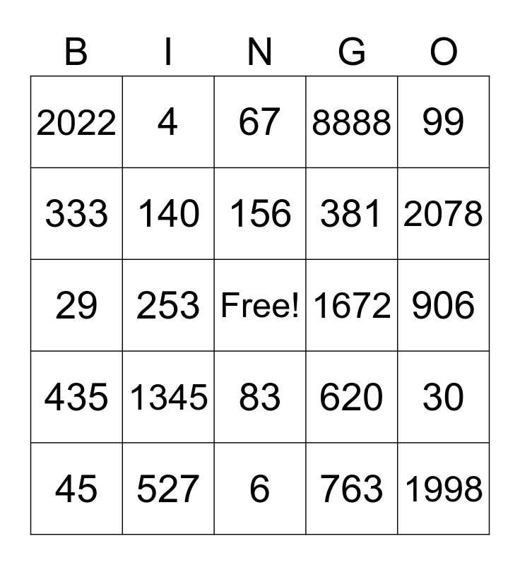 This bingo card has a free space and 24 words: 1345, 527, 156, 45, 99, 2022, 333, 4, 1672, 83, 381, 29, 620, 30, 140, 763, 906, 67, 2078, 253, 1998, 435, 8888 and 6.