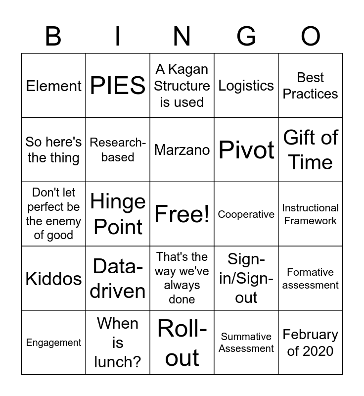 This bingo card has a free space and 33 words: Hattie, Effect Size, Hinge Point, Efficacy, Kiddos, Research-based, Best Practices, Engagement, PIES, A "joke" that no one laughs at, Marzano, A Kagan Structure is used, HumanEx, Collaboration, Cooperative, Gift of Time, When is lunch?, Don't let perfect be the enemy of good, Data-driven, Sign-in/Sign-out, That's the way we've always done, ISBE, Element, Instructional Framework, Roll-out, February of 2020, Logistics, Pivot, So here's the thing, Formative assessment, Exit Slip, Summative Assessment and A "what-if" question is asked.