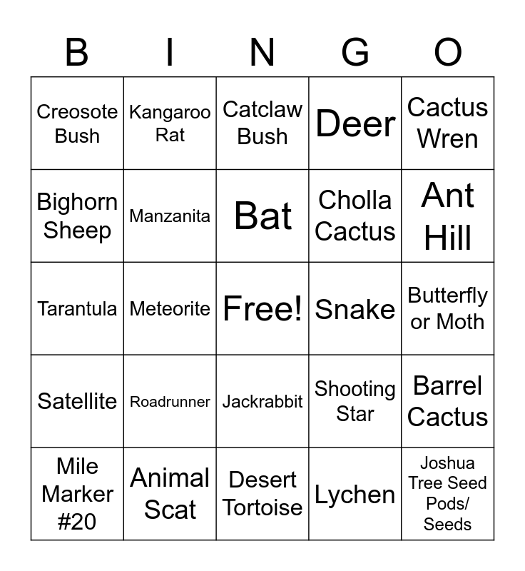 This bingo card has a free space and 30 words: Animal Scat, Animal Tracks, Meteorite, Petroglyphs, Creosote Bush, Catclaw Bush, Manzanita, Jackrabbit, Snake, Desert Tortoise, Butterfly or Moth, Joshua Tree Seed Pods/ Seeds, Lychen, Juniper, Ant Hill, Mesquite, Shooting Star, Satellite, Roadrunner, Cactus Wren, Tarantula, Lizard, Kangaroo Rat, Cholla Cactus, Bighorn Sheep, Deer, Barrel Cactus, Mile Marker #20, Bat and Dragonfly.