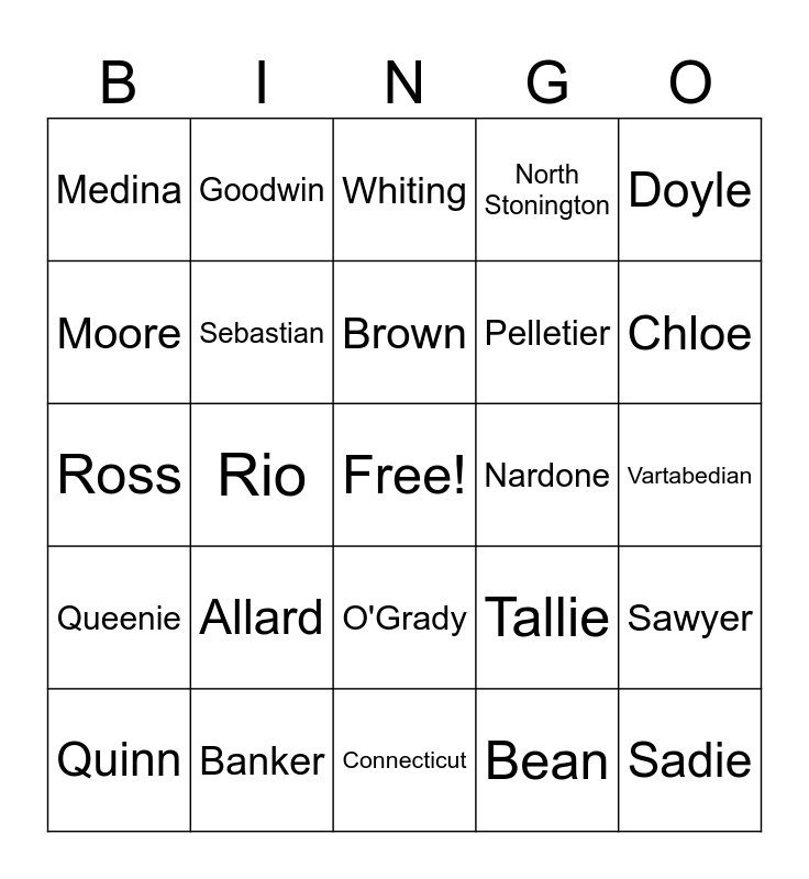 This bingo card has a free space and 24 words: Allard, Banker, Brown, Quinn, Doyle, Medina, Moore, Goodwin, Nardone, O'Grady, Pelletier, Ross, Tallie, Sawyer, Sebastian, Bean, Vartabedian, Whiting, Chloe, Rio, Sadie, Queenie, North Stonington and Connecticut.