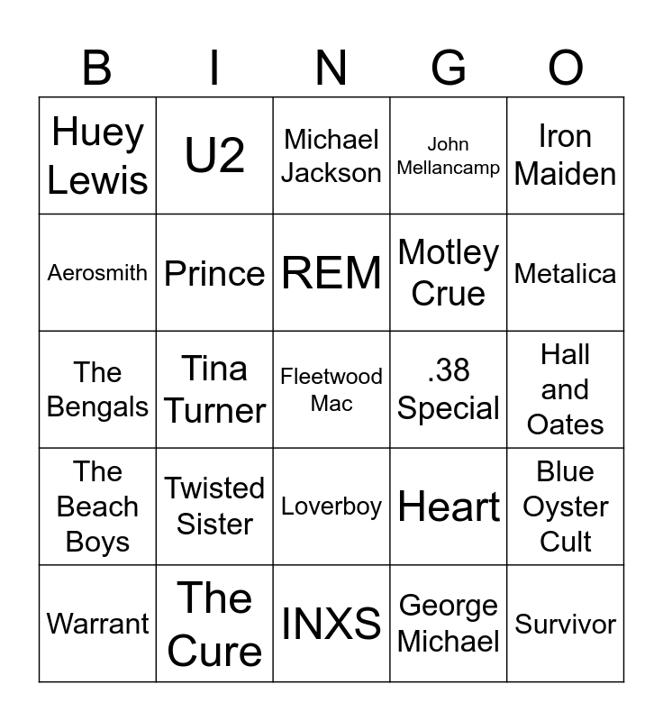 This bingo card has 75 words: Elton John, George Thorogood, Michael Jackson, Rod Stewart, Billy Joel, Pink Floyd, Motorhead, Judas Priest, Megadeath, Madonna, Survivor, Van Halen, REM, Aerosmith, Kenny Loggins, Tina Turner, Guns n Roses, Fleetwood Mac, Bon Jovi, Iron Maiden, Duran Duran, The Bengals, Prince, U2, John Mellancamp, Skid Row, Faith No More, The Police, Kiss, ZZ Top, Whitesnake, Cindi Lauper, Scorpions, Heart, Metalica, Motley Crue, Red Hot Chili Peppers, Dire Straits, Hall and Oates, George Michael, Men At Work, Tears for Fears, Tom Petty, Ratt, Devo, Poison, Warrant, Huey Lewis, Foreigner, Genesis, Chicago, Loverboy, Toto, Rush, Styx, Yes, Bryan Adams, The Cars, Blondie, Pantera, Twisted Sister, Quiet Riot, Violent Femmes, Europe, The Clash, .38 Special, Asia, Georgia Satelites, The Eagles, Blue Oyster Cult, The Beach Boys, The Cure, Def Leppard, INXS and Starship.
