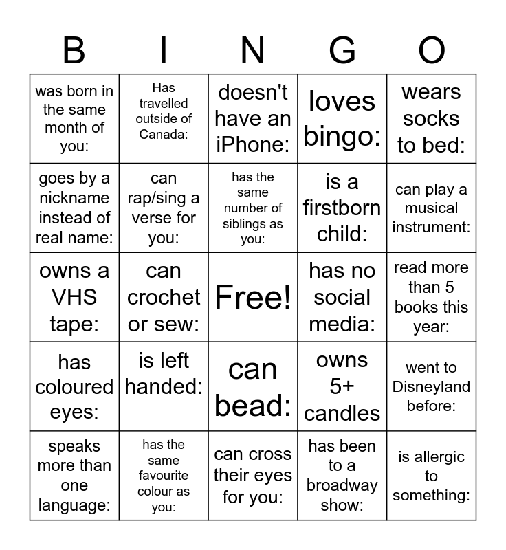 This bingo card has a free space and 24 words: is left handed:, has the same favourite colour as you:, has the same number of siblings as you:, speaks more than one language:, wears socks to bed:, was born in the same month of you:, goes by a nickname instead of real name:, Has travelled outside of Canada:, has no social media:, can bead:, is a firstborn child:, owns a VHS tape:, owns 5+ candles, went to Disneyland before:, can rap/sing a verse for you:, has been to a broadway show:, read more than 5 books this year:, doesn't have an iPhone:, can play a musical instrument:, can crochet or sew:, is allergic to something:, has coloured eyes:, loves bingo: and can cross their eyes for you:.