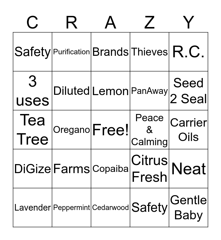 This bingo card has a free space and 24 words: Farms, Peppermint, Lemon, Lavender, R.C., Safety, 3 uses, Purification, Peace & Calming, Copaiba, PanAway, Tea Tree, Citrus Fresh, Neat, Diluted, Safety, Carrier Oils, Brands, Seed 2 Seal, Oregano, Gentle Baby, DiGize, Thieves and Cedarwood.