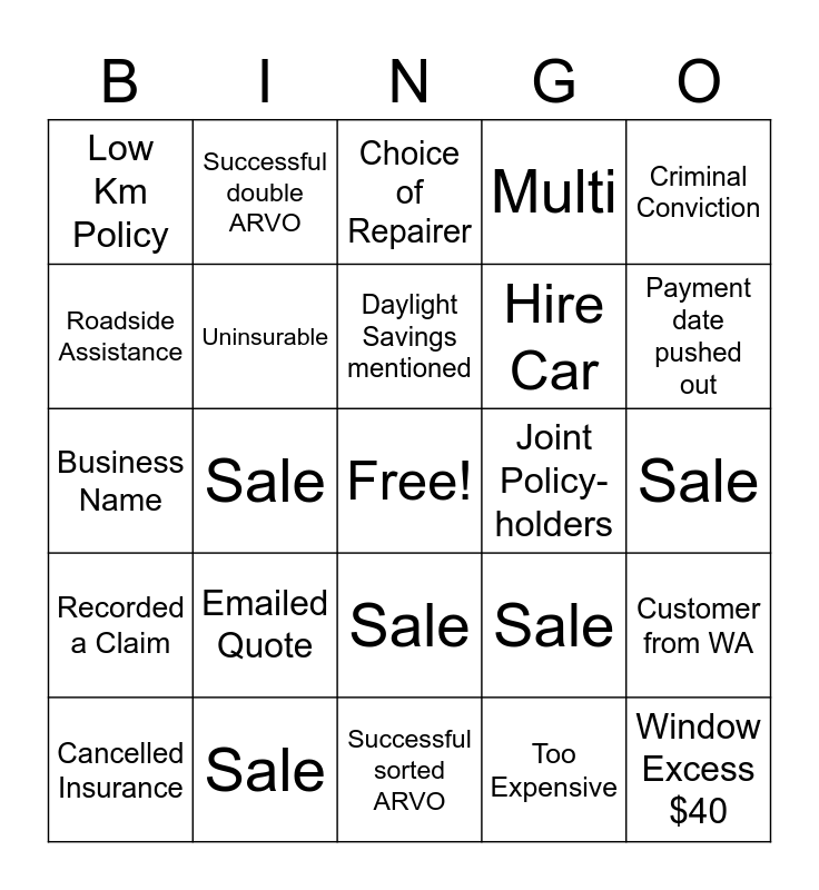 This bingo card has a free space and 24 words: Emailed Quote, Sale, Daylight Savings mentioned, Cancelled Insurance, Criminal Conviction, Low Km Policy, Roadside Assistance, Successful double ARVO, Joint Policy-holders, Sale, Hire Car, Business Name, Sale, Customer from WA, Uninsurable, Too Expensive, Sale, Choice of Repairer, Payment date pushed out, Sale, Window Excess $40, Recorded a Claim, Multi and Successful sorted ARVO.