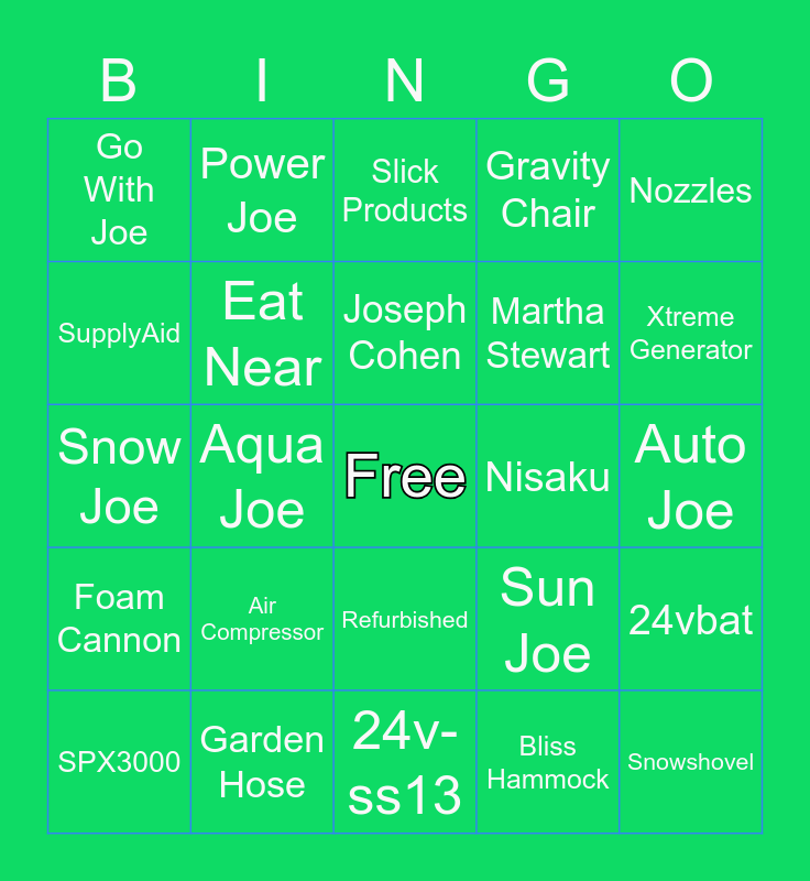 This bingo card has a free space and 24 words: SPX3000, Air Compressor, Joseph Cohen, Bliss Hammock, Nozzles, Go With Joe, Power Joe, Slick Products, Nisaku, Auto Joe, Snow Joe, Eat Near, Sun Joe, 24vbat, SupplyAid, Garden Hose, 24v-ss13, Gravity Chair, Xtreme Generator, Foam Cannon, Aqua Joe, Refurbished, Martha Stewart and Snowshovel.