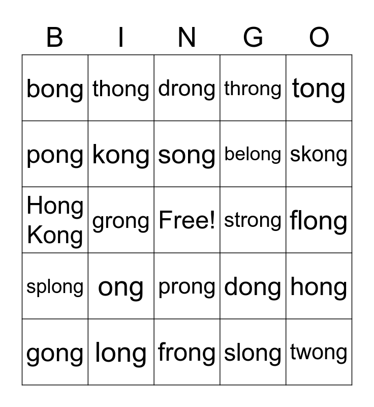 This bingo card has a free space and 24 words: ong, long, song, gong, tong, bong, pong, thong, strong, prong, belong, Hong Kong, dong, hong, kong, slong, flong, drong, skong, grong, twong, splong, throng and frong.