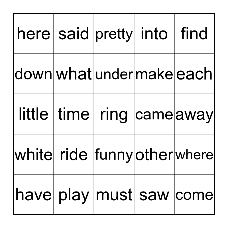 This bingo card has 25 words: ride, must, under, have, find, here, down, said, came, funny, make, little, other, where, what, come, away, pretty, each, time, ring, play, white, into and saw.