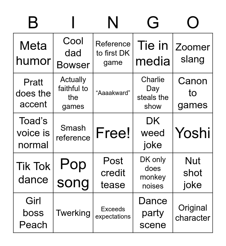 This bingo card has a free space and 24 words: Pop song, Twerking, “Aaaakward”, Girl boss Peach, Zoomer slang, Meta humor, Pratt does the accent, Cool dad Bowser, DK weed joke, Post credit tease, Charlie Day steals the show, Toad’s voice is normal, DK only does monkey noises, Nut shot joke, Actually faithful to the games, Dance party scene, Yoshi, Reference to first DK game, Canon to games, Smash reference, Original character, Tik Tok dance, Tie in media and Exceeds expectations.