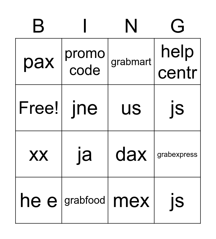 This bingo card has 16 words: grabfood, grabexpress, grabmart, pax, xx, promo code, dax, mex, Free!, jne, he e, help centr, ja, js, us and js.