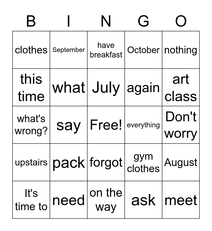 This bingo card has a free space and 29 words: It's time to, wake up, say, change, clothes, have breakfast, what, pack, everything, need, Don't worry, meet, on the way, ask, art class, today, forgot, upstairs, nothing, what's wrong?, gym clothes, P.E. class, again, this time, October, September, August, July and June.