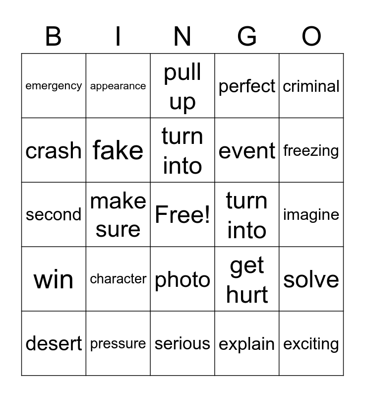 This bingo card has a free space and 39 words: act, alive, bleed, fake, desert, photo, turn into, actor, criminal, win, make sure, perfect, exciting, imagine, turn into, character, look real, emergency, stunt, get hurt, crash, serious, event, freezing, engine, could, act, alive, survive, appearance, movie, check, pull up, pressure, explain, several, solve, second and tire.