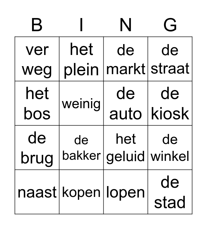 This bingo card has 16 words: kopen, de winkel, de markt, ver weg, de brug, het plein, het geluid, lopen, het bos, weinig, naast, de straat, de bakker, de kiosk, de auto and de stad.