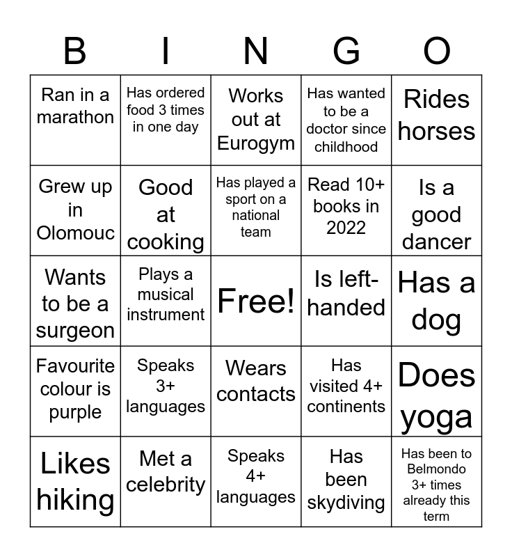 This bingo card has a free space and 24 words: Speaks 3+ languages, Met a celebrity, Has played a sport on a national team, Likes hiking, Rides horses, Ran in a marathon, Grew up in Olomouc, Has ordered food 3 times in one day, Is left-handed, Wears contacts, Read 10+ books in 2022, Wants to be a surgeon, Has visited 4+ continents, Does yoga, Good at cooking, Has been skydiving, Has a dog, Works out at Eurogym, Is a good dancer, Plays a musical instrument, Has been to Belmondo 3+ times already this term, Favourite colour is purple, Has wanted to be a doctor since childhood and Speaks 4+ languages.