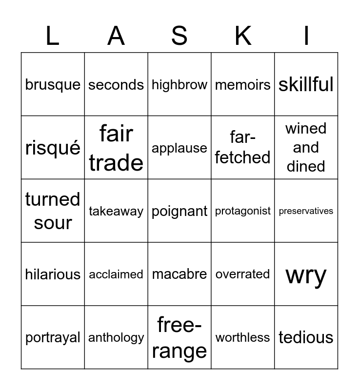 This bingo card has a free space and 44 words: harrowing, tedious, miscast, portrayal, evocative, worthless, highbrow, intriguing, skillful, anthology, memoirs, protagonist, macabre, acclaimed, additives, free-range, spice up, turned sour, wholesome, wined and dined, seconds, teetotal, sluggish, brusque, sullen, preservatives, lugubrious, exquisite, overrated, hilarious, sophisticated, wry, battery-farming, fussy eater, takeaway, unprocessed, journal, transparent, applause, risqué, far-fetched, eponymous, fair trade and split the bill.