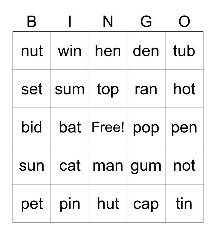 This bingo card has a free space and 24 words: cat, pin, top, pet, tub, nut, set, win, pop, man, ran, bid, gum, not, sum, cap, pen, hen, hot, bat, tin, sun, den and hut.